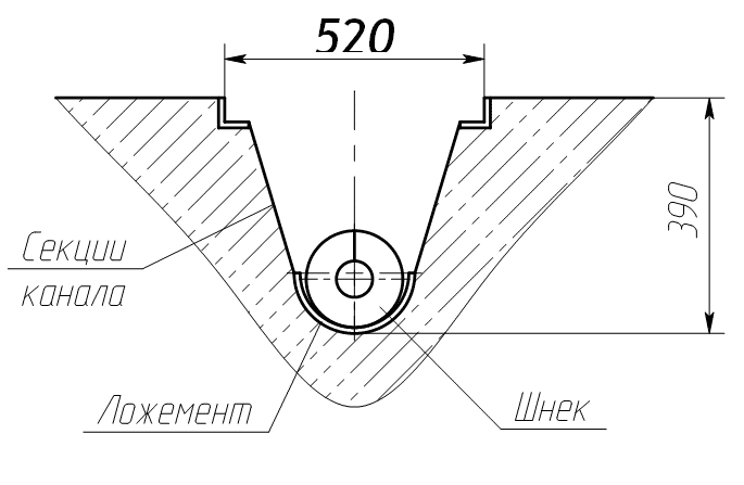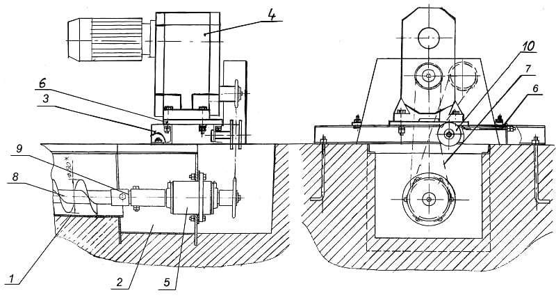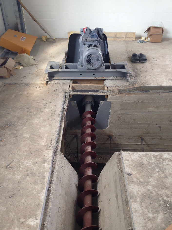 Транспортёр шнековый горизонтальный устанавливается в специальных каналах, выполненных из бетона, дно которых выполнено из металлической полутрубы по всей длине канала. Глубина канала 0,4 м ниже уровня пола.